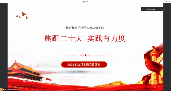 2022年11月10日,学生第三党支部开展了“焦距二十大 实践有力度”主题党日活动。会议由支部书记冯梅老师主持,全体党员参加。