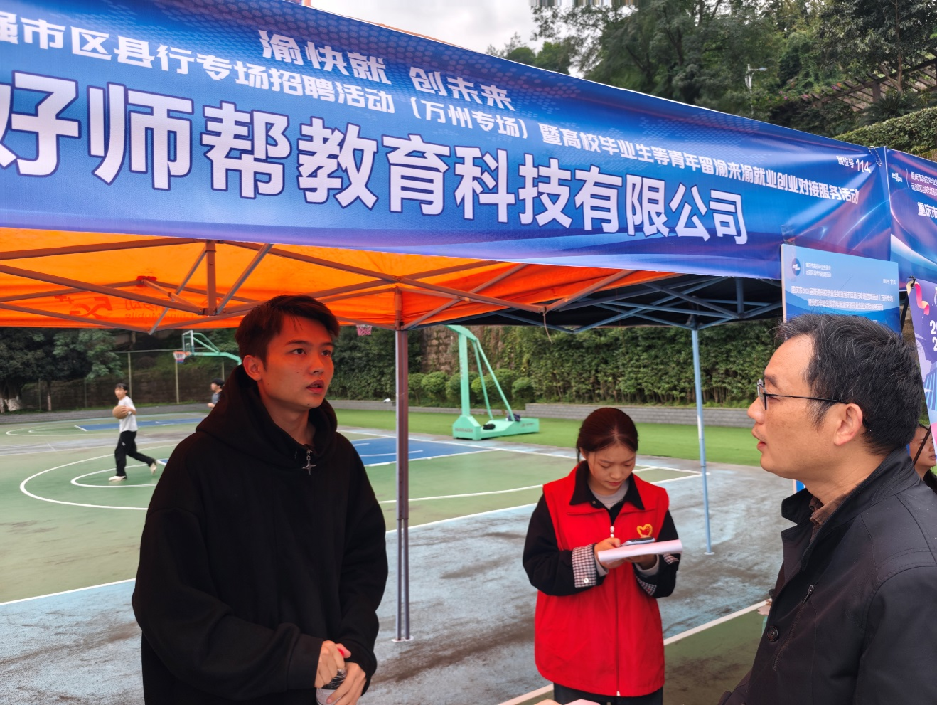 招聘会现场气氛热烈,众多优质企业汇聚一堂,为毕业生提供了诸多的就业岗位。在重庆好师帮教育科技有限公司展位前,鄢沛书记与公司招聘专员孙传凯进行了深入交流。他详细了解了企业的用人标准、岗位需求、薪资待遇及职业发展路径,并就当前教育科技行业的发展趋势和人才需求特点交换了意见。孙传凯专员表示,公司高度重视人才的全面发展和长期培养,期待通过此次招聘吸纳更多优秀毕业生,共同助力重庆地区教育事业的创新与提升。随后,他还耐心解答了同学们提出的各类问题,现场互动踊跃。交流结束后,鄢沛书记诚挚邀请重庆好师帮教育科技有限公司来我院开展后续招聘及合作活动。
