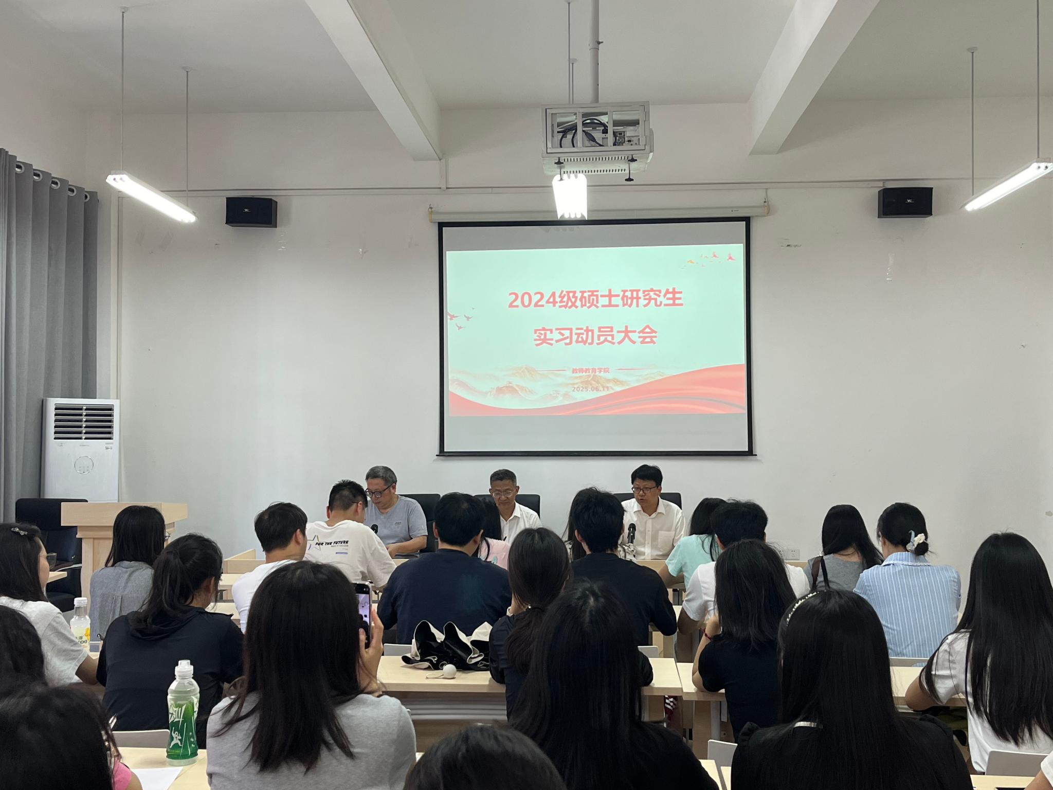 6月11日15:00,学院在博学楼3栋138会议室召开了2024级教育硕士研究生实习动员大会。院长潘勇、小学教育系主任罗孟祥、物理系主任贺叶露、研究生辅导员冯梅、研究生秘书张娜莎和全体2024级硕士研究生参会,会议由学院副院长许刚主持。